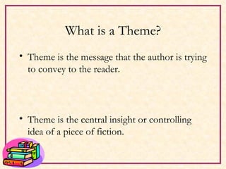 The document discusses what theme is and how to identify it in a work of fiction. It states that theme is the central insight or controlling idea that an author aims to convey, and exists when a story attempts to accurately portray life or reveal some truth about it. To find theme, one can analyze how the protagonist changes, the central conflict and its resolution, and whether the title has significant meaning. When writing about theme, it should be expressed as a generalization about life rather than using character names or story specifics, and avoid absolute terms like "every" or "always." Theme statements must be supported by and not contradicted by the story's details.