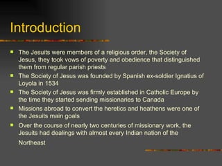 The document provides an overview of the Jesuit Relations, which were writings produced by Jesuit missionaries in New France (Canada) between 1632 and 1673. The Jesuits sought to convert indigenous peoples to Catholicism and relayed information on their missionary travels and observations of various Algonquian-speaking and Iroquoian tribes. The document summarizes chapters on the Montagnais people, the Huron language, impacts of disease, and warfare between tribes. It describes religious beliefs, village life, hunting practices, and relationships between Europeans and natives.