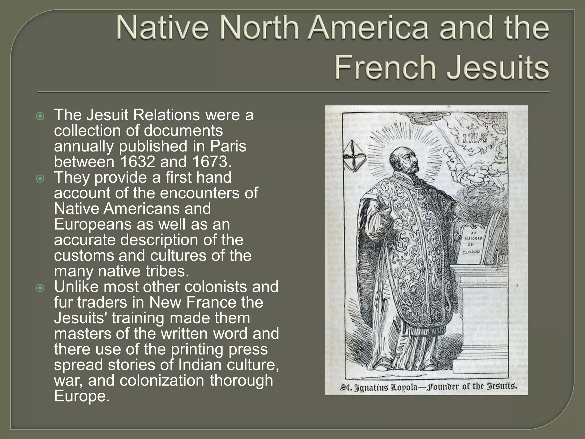 The Jesuit Relations were annual publications between 1632-1673 that provided first-hand accounts of encounters between Native Americans and Europeans in New France. They described customs and cultures of various tribes and spread stories of Indian life through Europe. Unlike other colonists, the Jesuits were skilled writers who documented their interactions with tribes like the Montagnais and Algonquins. Over time, the Relations depicted the Iroquois-French conflict and efforts of Jesuits to convert tribes like the Iroquois during periods of peace. They offered unique perspectives on Native cultures and spiritual beliefs.