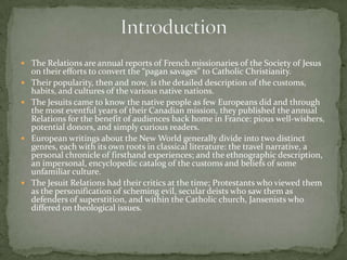 The document provides an overview of several topics covered in the Jesuit Relations annual reports from 17th century New France, including disease and medicine, diplomacy and war, writings on the natural environment, and martyrs and mystics. It describes how the Jesuits witnessed and documented the profound changes experienced by native populations as a result of exposure to European diseases, conflicts with colonists and other tribes, and cultural influences. Key figures like Isaac Jogues and Kateri Tekakwitha who suffered or demonstrated great faith are also summarized.