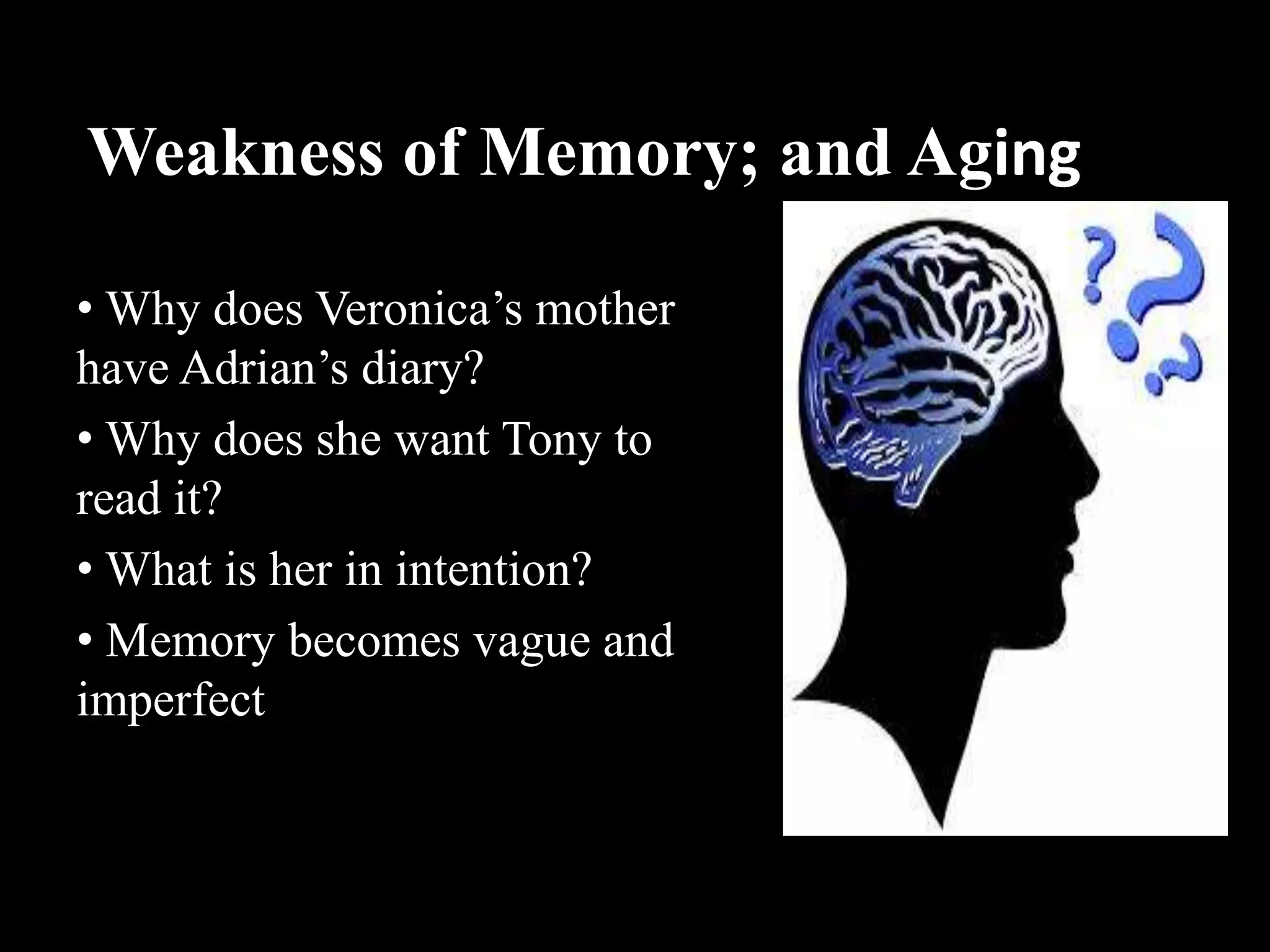 This document summarizes themes and motifs in the novel The Sense of an Ending by Julian Barnes. It discusses the themes of weakness of memory and aging, how memory becomes vague and imperfect over time. It also discusses the motif of suicide, noting there are two suicides in the novel - one character hangs himself after getting a girl pregnant, while the other suicide, of Adrian, is initially presented as rational but may not have been. The document also mentions a class conflict between two characters, Tony and Veronica.