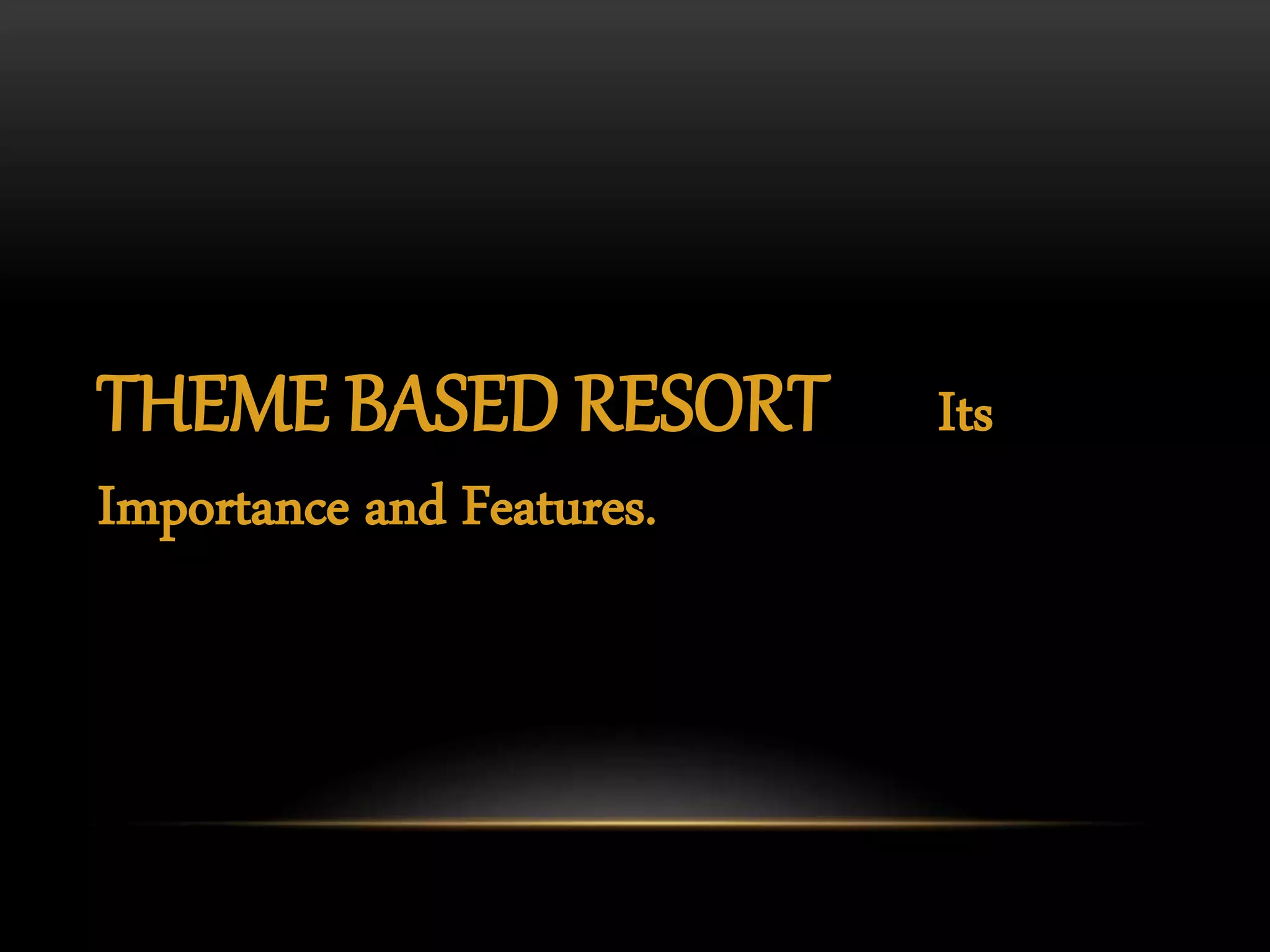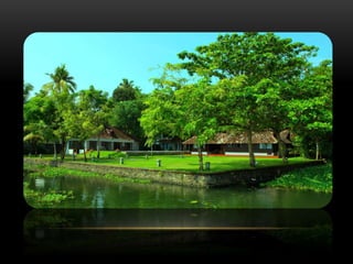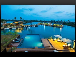 The document discusses different types of theme-based resorts, including their key features and examples. It describes wellness resorts that focus on health and wellness activities like Ayurveda and yoga. Island resorts are located on islands and provide an exotic experience, like the Bolgatty Palace resort in Kochi. Heritage resorts showcase local culture and architecture, such as the Shanthitheeram resort in Kumarakom. Floating resorts are built on water, for example the Aquatic resort in Kerala with underwater bedrooms. Lake resorts are situated around lakes, such as the Kumarakam Lake Resort in Kerala.