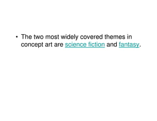 Science fiction and fantasy are the most widely covered themes in concept art. Concept art has traditionally been used in film poster design but has expanded to cover many genres used in video games. Science fiction explores possible future worlds and technologies through rational narratives, differing from fantasy through its grounding in scientific possibility even if some imaginative elements break natural laws. Common science fiction elements include settings in the future, space, other worlds, aliens, futuristic technology, altered physics, new social systems, and paranormal abilities.