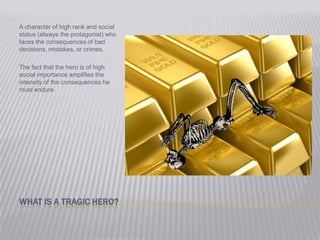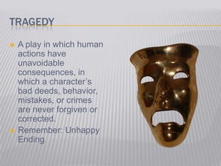 Tragedy is a play that depicts unavoidable consequences of human actions, where mistakes are never forgiven. A tragic hero is the protagonist of high social status who faces intense consequences due to bad decisions. Theme is the implied message about life, society or human nature conveyed by the author. In Sonnet 130, Shakespeare's theme is that true love and beauty are subjective, not defined by physical appearance.