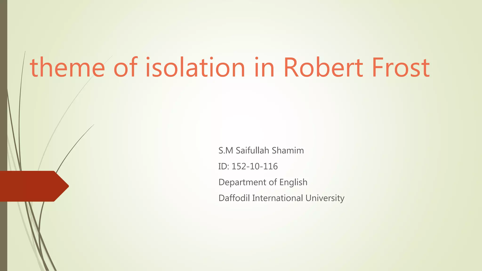 This document discusses the theme of isolation in the poetry of Robert Frost. It provides examples from several of Frost's poems where lonely figures encounter a strange world with few connections. Poems mentioned include "Tuft of Flowers," "The Road Not Taken," and "Stopping by Woods on a Snowy Evening." The butterfly in "Tuft of Flowers" and the traveler in "The Road Not Taken" experience isolation. Most of Frost's characters are isolated in some way and communicate through monologues. His poetry also features mystery and darkness. In the end, the document analyzes how Frost portrayed isolation and solitude through detached figures with unique perspectives.