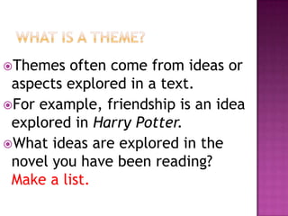 The document discusses how to identify and analyze themes in novels. It explains that a theme is not just a single word or idea, but rather what the author is saying about that idea. Students are instructed to identify ideas explored in the novel they read, determine what the author is saying about those ideas to develop them into themes. They are then asked to analyze how the themes are presented and developed through characters, plots, settings, and style and to evaluate which theme is most important in the novel.