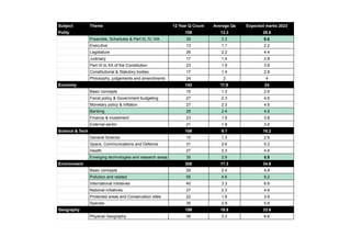The document provides information on the expected questions and marks distribution for the UPSC Civil Services Preliminary Examination in 2023. It lists the various themes/topics that may be covered in the exam, the number of questions expected from each theme, and the expected total marks. Some of the major themes include Polity, Economy, Environment, Science and Technology, History, and Geography. Under each theme, specific topics from the past years that can be tested in 2023 are identified.