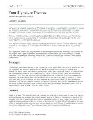 This document summarizes Cherlyn Jensen's top five signature themes as identified through the StrengthsFinder assessment: