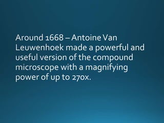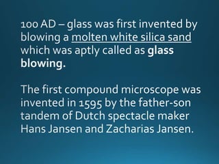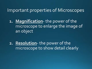 The document describes the components and functions of a microscope, an optical instrument used for magnifying small objects. Key parts include the eyepiece, body tube, revolving nosepiece, stage, adjustment knobs, and light source. It emphasizes the role of objective lenses in enhancing magnification and the usage of various knobs and diaphragms for focusing and lighting the specimen.
