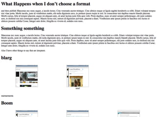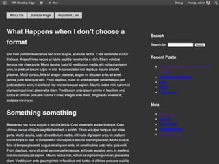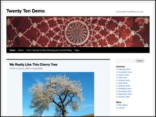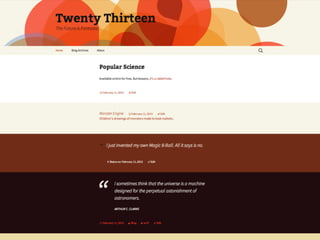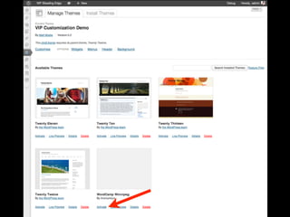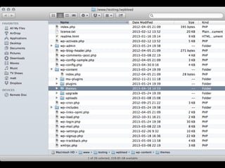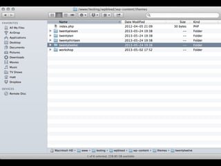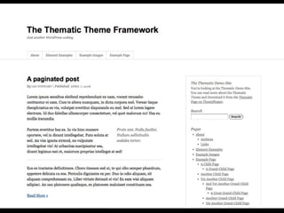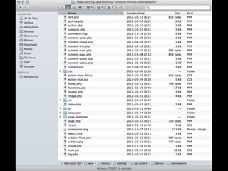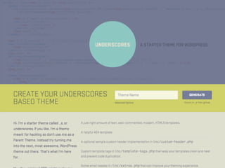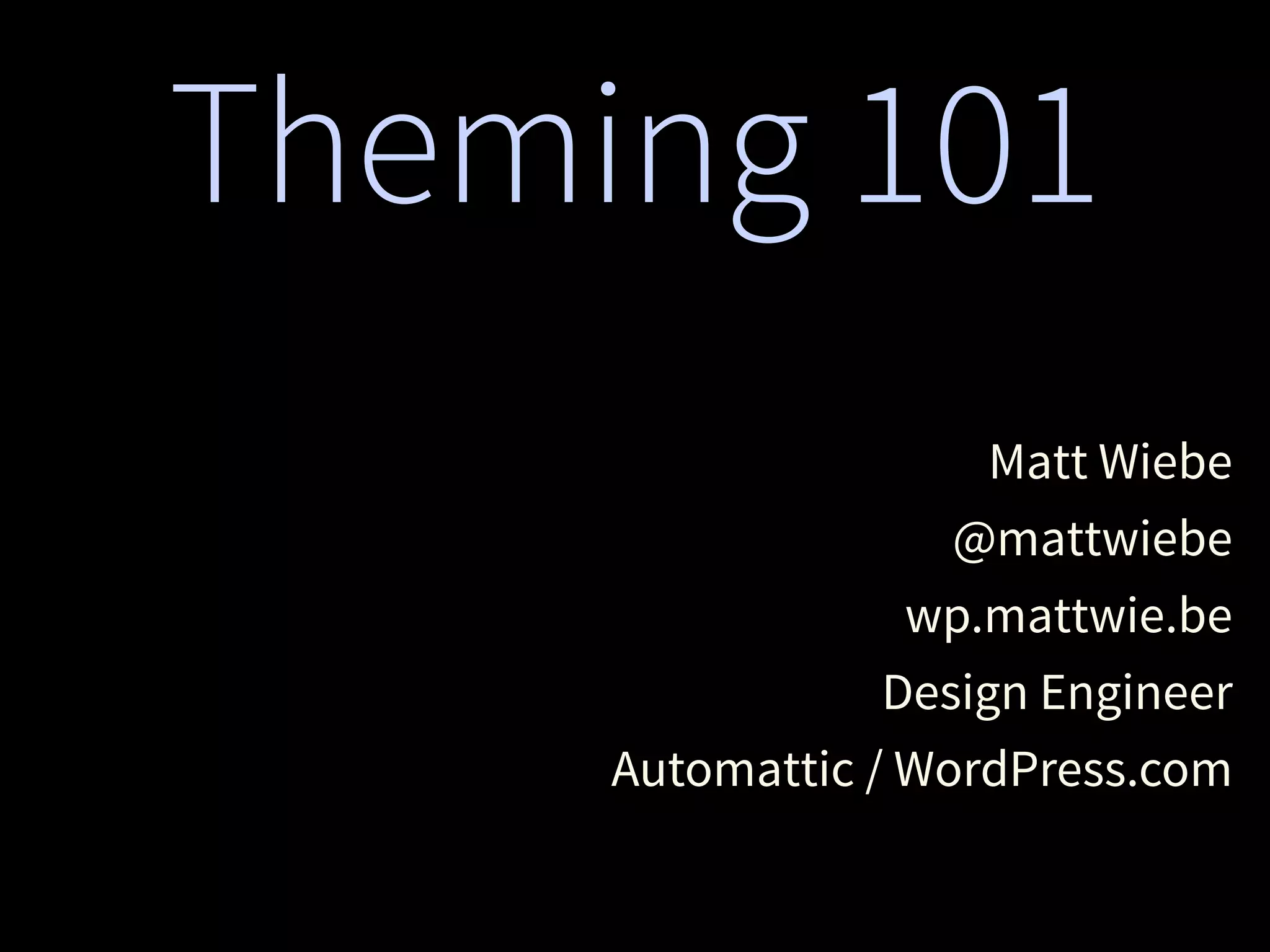 The document provides an introduction to creating WordPress themes. It explains that a theme is a collection of files that produce the graphical interface of a website. It demonstrates how to create a basic theme by developing a style.css file and index.php file. It also discusses additional template files, using The Loop to output posts, registering sidebars in functions.php, and learning from starter themes like _s to implement best practices. The overall document serves as a beginner's guide to getting started with theme development in WordPress.