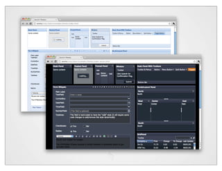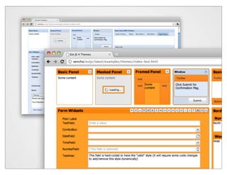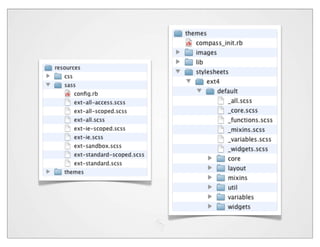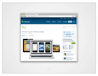 The document discusses theming and styling for the Sencha Touch framework using CSS and SASS. It covers various features like variables, mixins, nesting, and functions in SASS, as well as providing examples of CSS3 properties. Additionally, it includes links to resources and tools for designing and optimizing themes in web development.