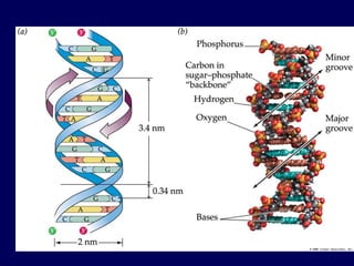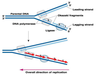 The document details the molecular structure of DNA, its replication process, and the mechanisms involved in transcription and translation. DNA consists of nucleotides with specific base pairing rules and is replicated in a semi-conservative manner, facilitated by various enzymes. Additionally, the document addresses the process of RNA synthesis from DNA and its subsequent translation into proteins, emphasizing the complex interplay of biochemical reactions and regulatory elements.