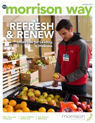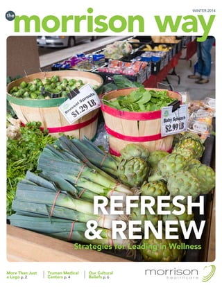 The document discusses strategies for leading in wellness through food and nutrition services. It describes Morrison Healthcare's new programs and initiatives, including a station-by-station menu refresh designed to continuously provide customers variety and updated options. It also outlines Morrison's focus on regulatory readiness and customized quality assurance programs to help partners achieve and maintain compliance with regulations.