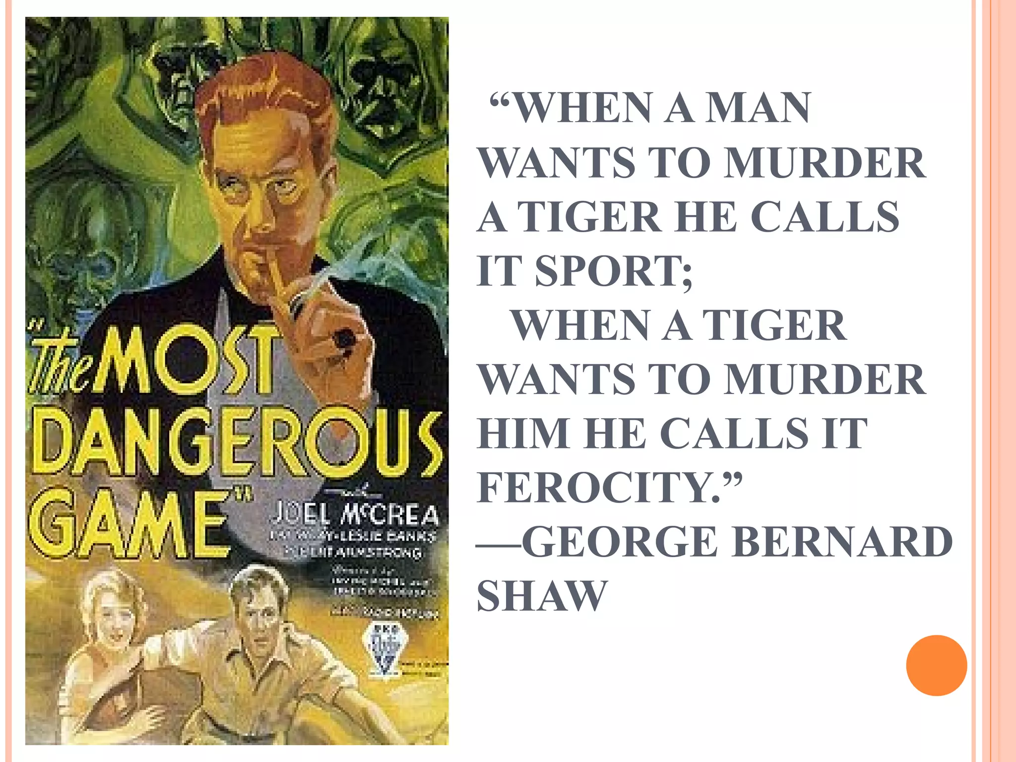 Sanger Rainsford, an experienced hunter, finds himself shipwrecked on an island owned by General Zaroff. Zaroff reveals that he enjoys hunting humans as the most dangerous game. He offers Rainsford the chance to be hunted, with the caveat that if Rainsford can evade Zaroff for three days, Zaroff will cease his hunting. Over the next three days, Rainsford uses his survival and hunting skills to evade Zaroff and his hounds. On the third day, Rainsford manages to kill both Zaroff and his servant Ivan, ending the dangerous game.