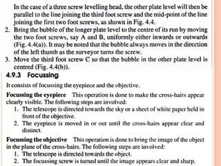 The document provides information about theodolites. It begins with an introduction stating that a theodolite is used to measure horizontal and vertical angles more precisely than a magnetic compass. It then discusses the main parts of a theodolite including the horizontal circle, vertical circle, telescope, and levels. The document also covers the history of theodolites from their early origins to modern electronic versions. It describes how to operate a transit vernier theodolite including terms like centering, transiting, swinging the telescope, and changing face. Finally, it discusses the permanent and temporary adjustments needed to ensure accurate theodolite measurements.