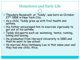 Theodore Roosevelt was born in New York City in 1858. He came from a wealthy family and overcame poor health as a child through vigorous exercise. Roosevelt graduated from Harvard and married his first wife, Alice, in 1880. After her death in 1884, he married Edith Kermit Carow in 1886 and had five children with her. Roosevelt was a Republican who became president after William McKinley was assassinated in 1901. He served two terms as president from 1901-1909, during which he established many national forests and parks and passed important consumer protection laws.