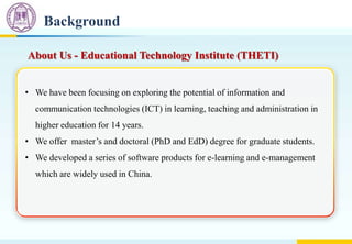The document discusses research on learning analytics utilizing big data at Tsinghua University's Educational Technology Institute, highlighting their extensive experience in ICT for higher education. It outlines the scale of their platform, theol, which serves over 5 million users and provides data analysis across different dimensions for both students and faculty. The research includes various analytics levels focusing on personal performance, course design, and institutional metrics, aiming to enhance teaching and learning outcomes.