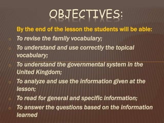 The document provides information about the British Royal Family. It discusses the lineage of Queen Elizabeth II and her role as monarch. It describes her family members including her husband Prince Philip and her children. It outlines some of the Queen's official duties and residences. It shares interesting facts about the long reign of Queen Elizabeth II and quizzes students on details about the Royal Family.