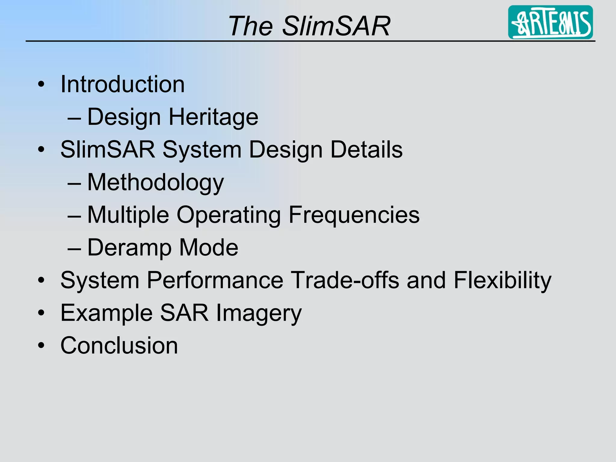 The document summarizes the design of the SlimSAR system, a small synthetic aperture radar designed for operation on small unmanned aircraft systems. Key points include: