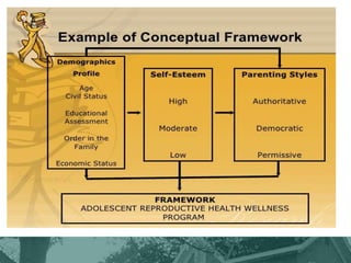 This document discusses theoretical and conceptual frameworks in research. It defines key concepts like theories, variables, and relationships between concepts. Theories can be grand, middle-range, descriptive, explanatory or predictive. Theoretical frameworks are derived from existing theories and provide the rationale for relationships between variables. Conceptual frameworks assemble concepts based on their relevance to a theme without being formally tested. Conceptual maps further explain relationships between concepts supported by literature. Frameworks guide research, practice and the generation of hypotheses.