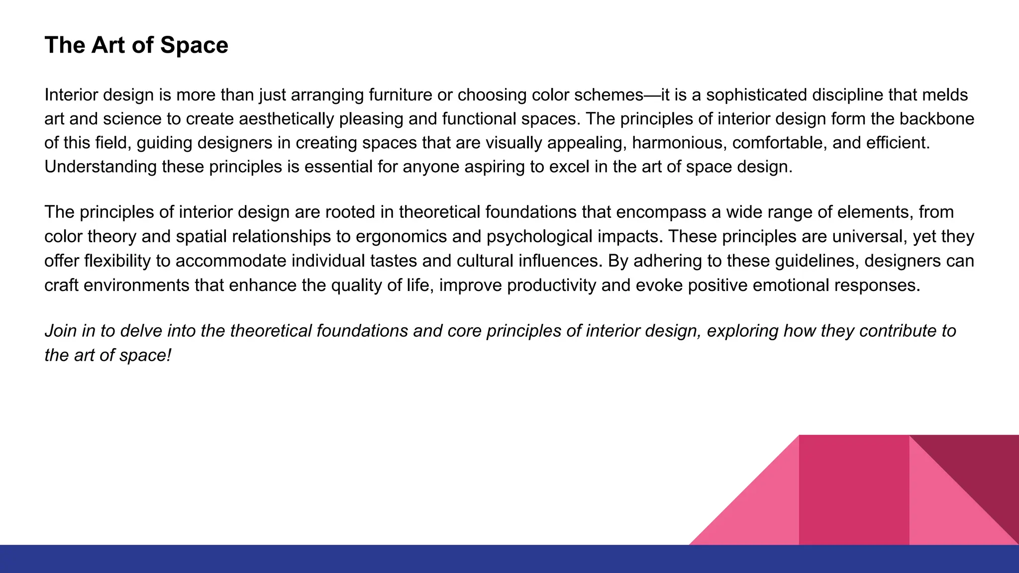 Interior design is a sophisticated discipline that blends art and science to create functional and aesthetic spaces, guided by principles like balance, harmony, rhythm, emphasis, proportion, and scale. These principles help designers craft environments that enhance quality of life, productivity, and emotional responses. Understanding the theoretical foundations of interior design is essential for aspiring designers to master the art of creating cohesive and engaging interiors.
