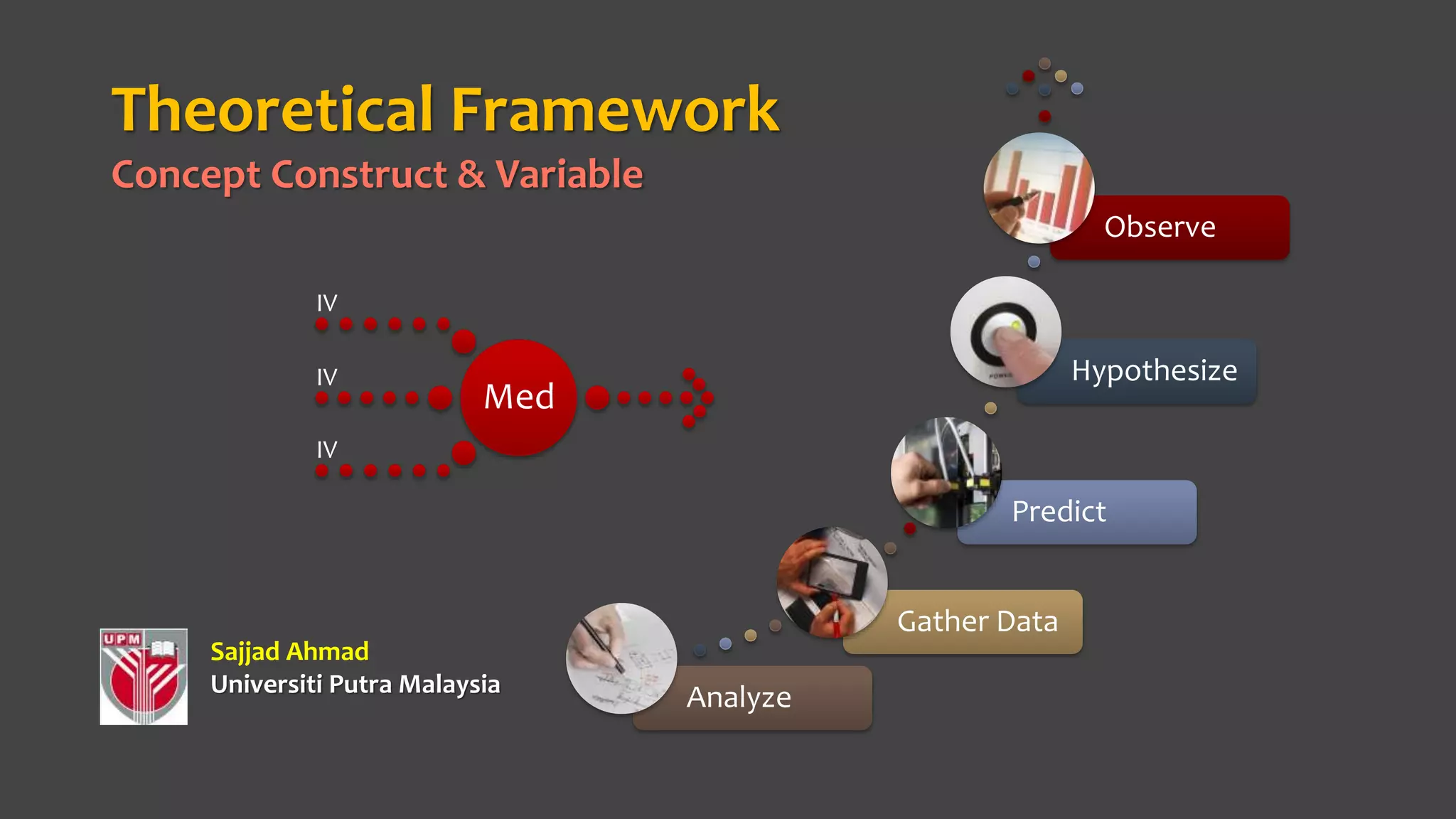 The document outlines the theoretical framework for research, emphasizing the importance of constructs and variables in hypothesis development and data analysis. It distinguishes between conceptual and operational definitions of constructs, and discusses how theoretical frameworks guide research methodology and interpretations. The framework helps clarify research problems by connecting literature reviews to the proposed investigation and supporting the rationale for studying specific relationships among variables.