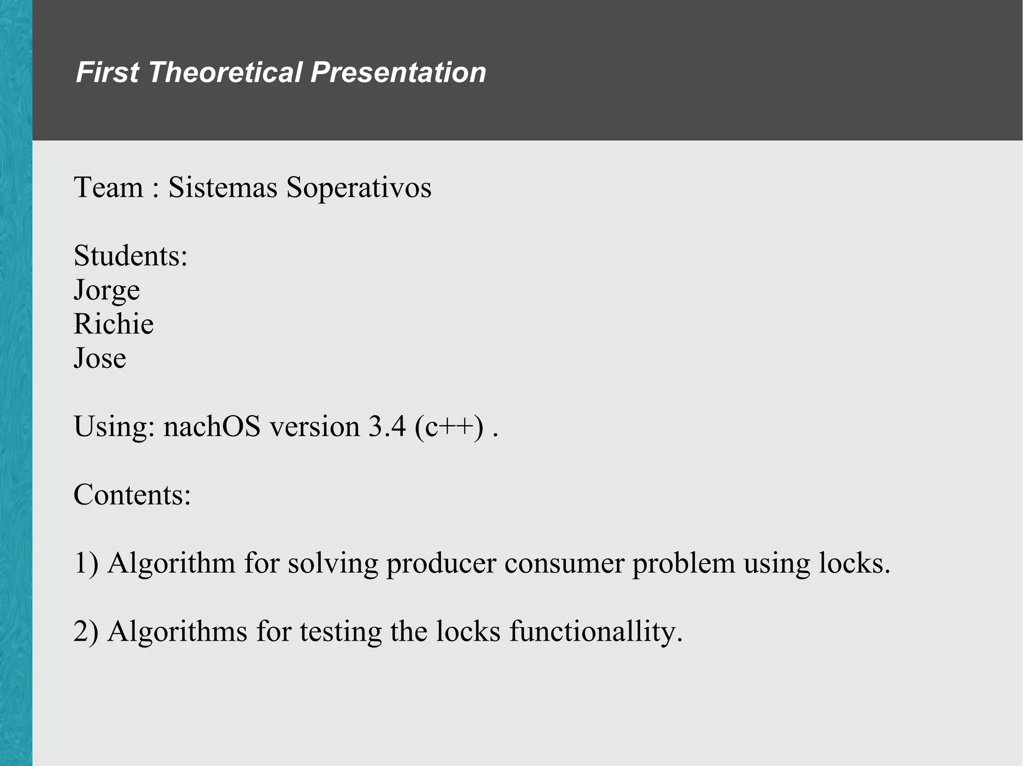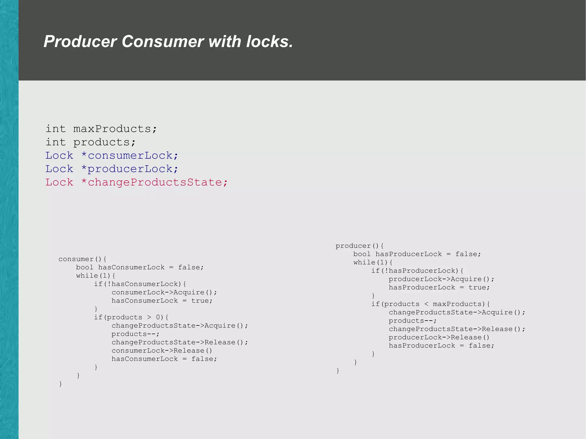 This document presents algorithms for solving the producer-consumer problem using locks in NachOS. It includes code for a producer and consumer that each acquire locks before accessing a shared resource, and algorithms for testing the lock functionality, including for fairness, liveness, and safety. Safety is demonstrated by intentionally creating a deadlock between two locks to show they cannot be acquired simultaneously by different threads.