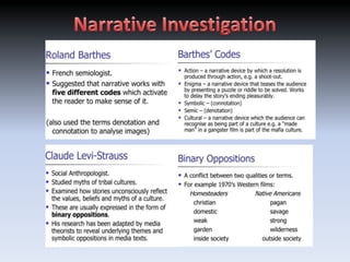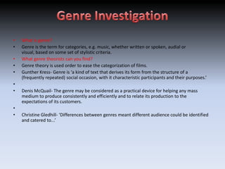 Genre theory is used to categorize films based on stylistic criteria. Genres help audiences identify different types of films and cater to their expectations. Narratives describe a sequence of events and follow common story structures identified by theorists like Propp and Todorov. Representation in media involves intentionally constructing artificial versions of reality. Audience theory considers how audiences interpret and are influenced by media texts. Research and planning are required to systematically develop knowledge and create goals for making a horror film, such as analyzing films and planning elements like plot, characters, and locations.