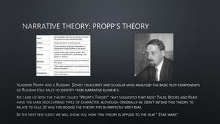 The document discusses several theories related to analyzing films and media texts, including auteur theory, genre theory, audience theory, and narrative theory. It provides examples of each theory and discusses how our group can apply these theories when creating our own media piece. Specifically, we will consider the auteur theory during production, genre theory in selecting the psychological thriller genre, audience theory by targeting "Reformer" and "Explorer" personality types, and narrative theory using Todorov's five-stage model.