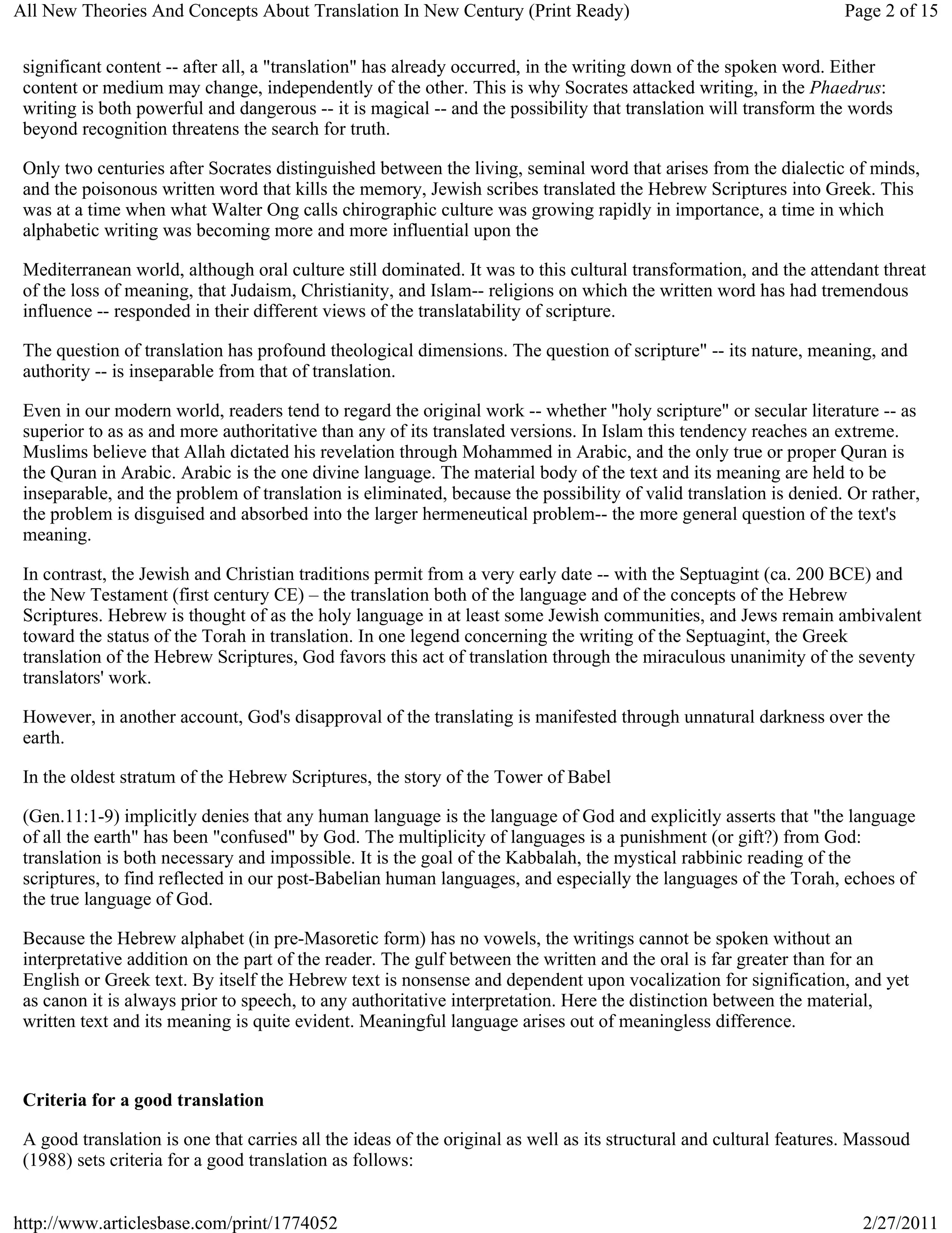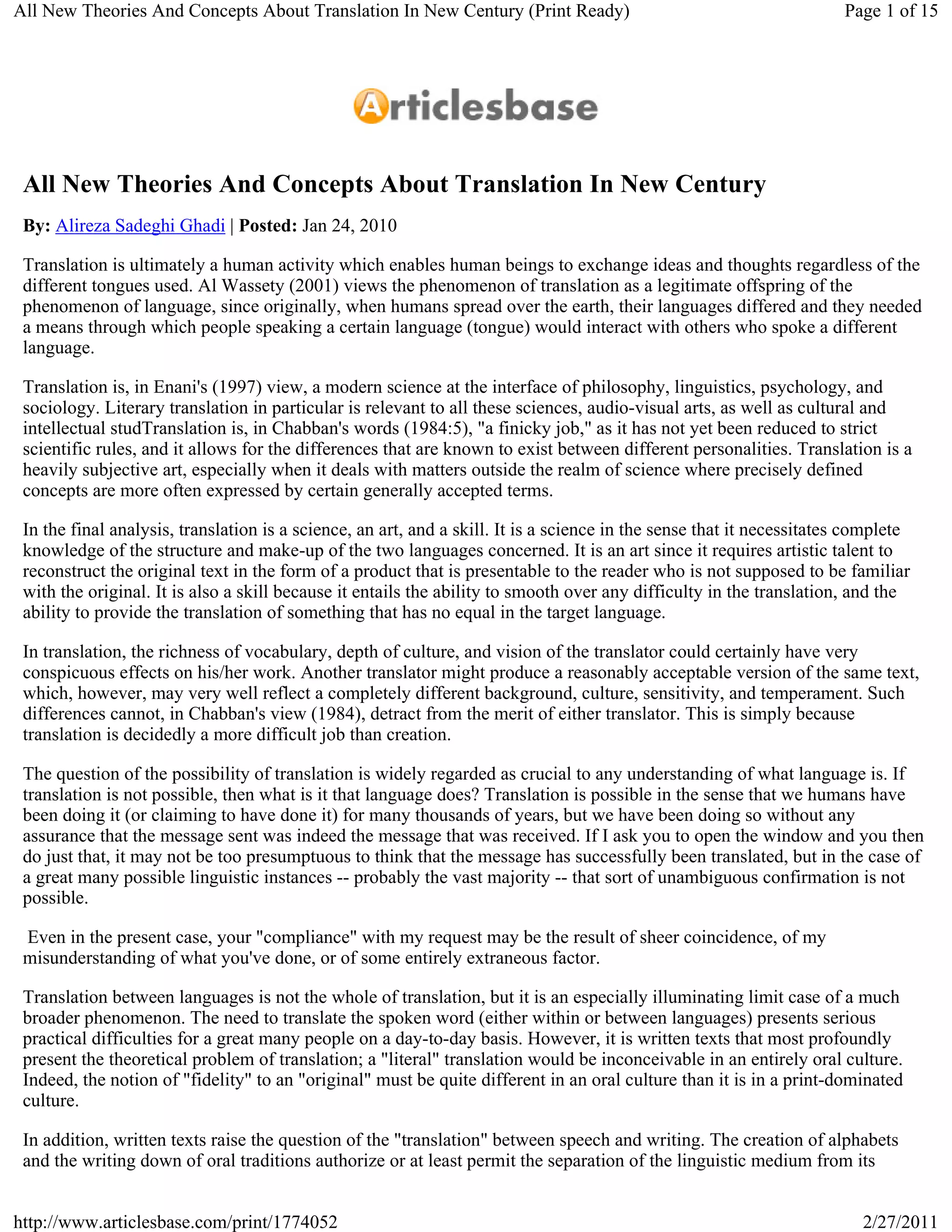 This document discusses theories and concepts about translation in the new century. It covers translation as a human activity that enables idea exchange across languages. Translation involves aspects of philosophy, linguistics, psychology and sociology. It is viewed as both an art and a science requiring language structure knowledge and artistic skill. The possibility and challenges of translation are examined, especially between written vs oral cultures. Criteria for a good translation include conveying ideas, structure, culture and being easily understood while preserving literary subtleties. Knowledge of source language grammar and vocabulary is important.