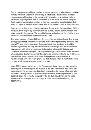 The document compares the urban patterns and public spaces of Roppongi, Japan and Jalan Tunku Abdul Rahman (Jalan TAR) in Kuala Lumpur, Malaysia. While Roppongi developed organically over time through narrow streets and piecemeal development, Jalan TAR began along rivers and spread outward as transportation improved. Both areas have sidewalk gardens and public plazas that serve as contact points where necessary, social, and optional activities occur, though the intensity varies based on environmental and cultural factors. Features like extended storefronts, public performances, and religious sites influence how people interact in the public spaces of each area.