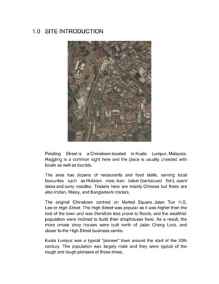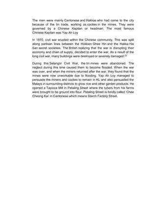 Petaling Street is a famous Chinatown in Kuala Lumpur, Malaysia known for its street markets and food. It originally centered around Market Square but expanded north along High Street. The area is home to dozens of restaurants and stalls selling local Chinese cuisine. While traditionally populated by Chinese traders, it now also hosts Indian, Malay, and Bangladeshi vendors. The street remains a vibrant commercial and cultural center attracting both locals and tourists.
