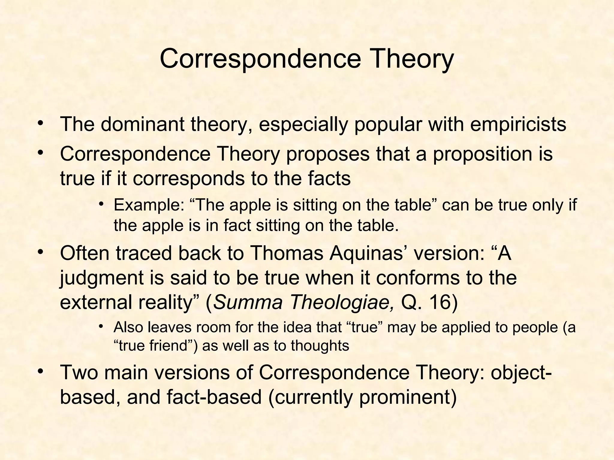 1. Correspondence theory proposes that a proposition is true if it corresponds to the facts in reality. It has strengths in simplicity and appealing to common sense but weaknesses in linguistic issues and circular reasoning.