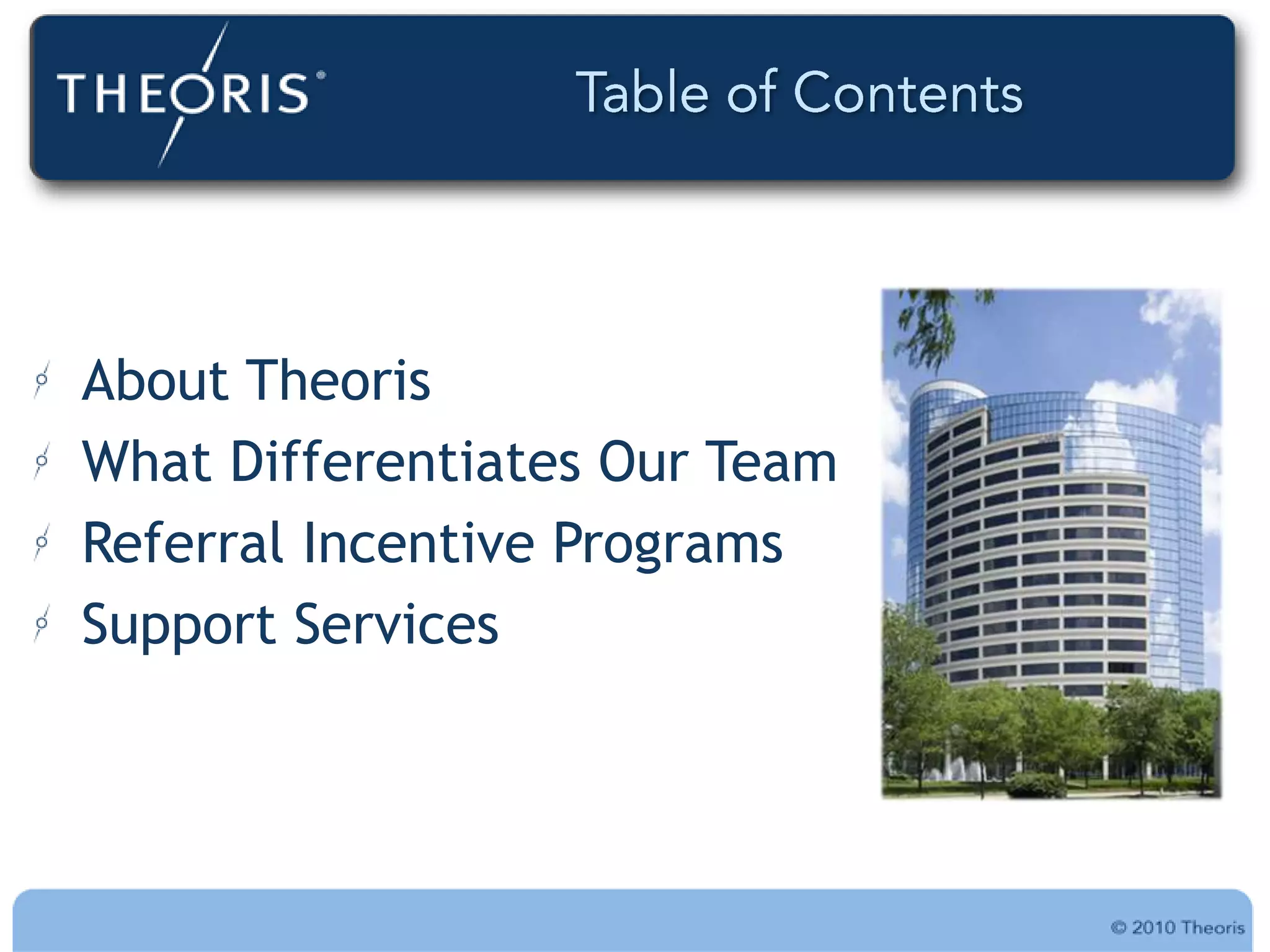Theoris is a full-service IT consulting firm that has been providing innovative solutions for over 25 years across many industries. They offer a wide range of strategic, staffing, and project-based IT services including enterprise portfolio management, process quality assessment, software development, and more. Theoris prides itself on consistency, cost-effective delivery, and proven methods. They discuss the importance of professionalism, communication, concern for clients, courtesy, responsiveness, and confidentiality in differentiating their consultans and building trust with clients.