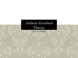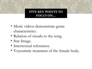 Andrew Goodwin's theory states that music videos demonstrate genre characteristics through elements like dance routines, stage performances, and visual styles. There is often a relationship between the visuals and lyrics of the song, whether illustrative or contradictory. Star image creates character for the music artist and develops their reputation over time. Music videos can also reference other media through intertextuality with other videos, films, TV, or brands. Finally, Goodwin's theory notes that many music videos treat the female body in a voyeuristic way through camera angles and shots that emphasize sexuality.
