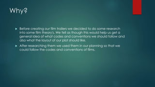 The document discusses several film theories that were researched to help structure the plot of a film trailer. It summarizes Todorov's narrative theory, which proposes films follow a five stage pattern: equilibrium, disruption, recognition, attempt to repair, new equilibrium. It also discusses Blumler and Katz's uses and gratifications theory, which explains why audiences seek out media to fulfill information, identity, social, and entertainment needs. Finally, it summarizes Propp's character archetypes and Dyer's star theory, which the document applies to consider characters and casting for the low-budget, British-style film trailer.