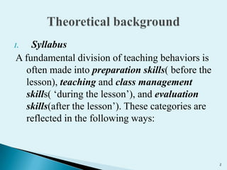 1) Lessons are typically divided into preparation, teaching/management, and evaluation stages.