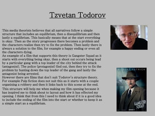 The document explores four media theorists - Tzvetan Todorov, Vladimir Propp, Claude Levi-Strauss, and Roland Barthes - and their theories on narrative structures. It discusses Tzvetan Todorov's view that narratives follow a structure of equilibrium, disequilibrium, and new equilibrium. It then examines Vladimir Propp's theory that stories contain up to eight character archetypes. Next, it covers Claude Levi-Strauss' idea that narratives revolve around binary opposites. The document analyzes how the theories relate to the films Gangster Squad, Cinderella, Pulp Fiction, and Lock, Stock and Two Smoking Barrels.