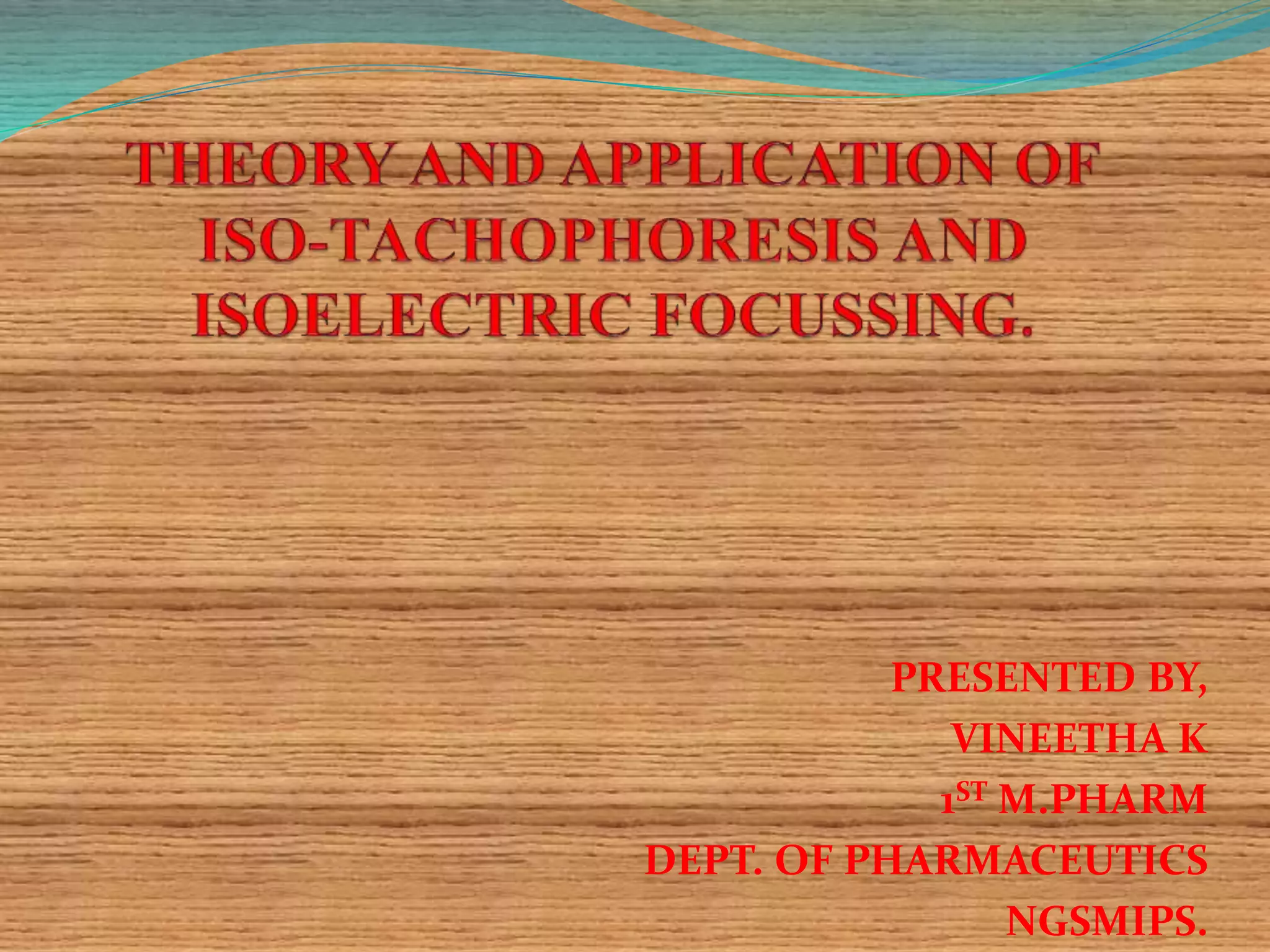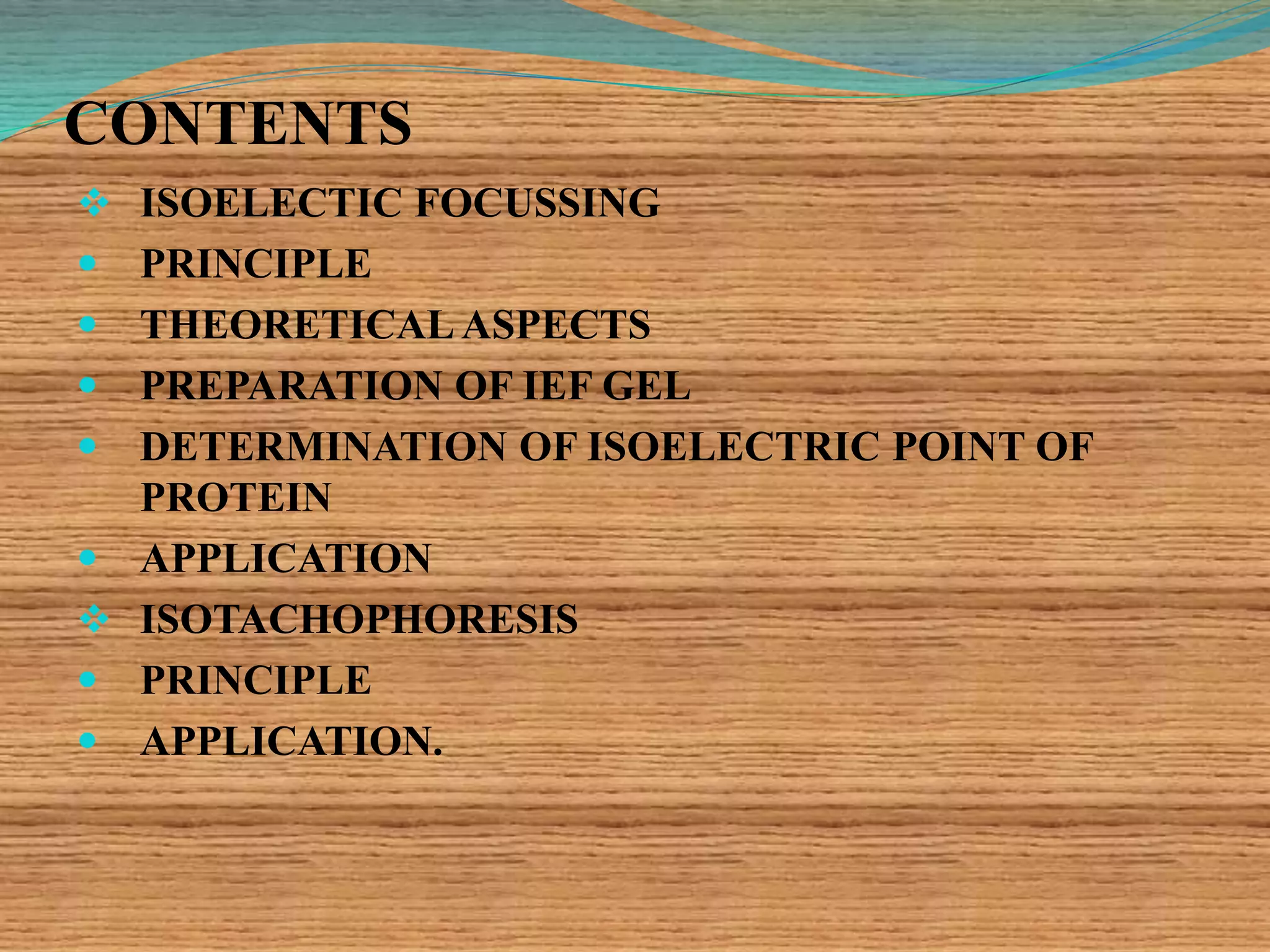 This document provides an overview of isoelectric focusing and isotachophoresis. Isoelectric focusing separates proteins according to their isolectric point (pI), which is the pH at which a protein has no net charge. It works by applying a potential across an immobilized pH gradient gel containing ampholytes. Proteins will migrate within the gel until they reach the pH that matches their pI and stop. Isotachophoresis separates ions based on their electrophoretic mobility by creating discrete zones within a discontinuous electrolyte system. Both techniques provide high resolution separation and have various applications in research, quality control, and identification of substances.