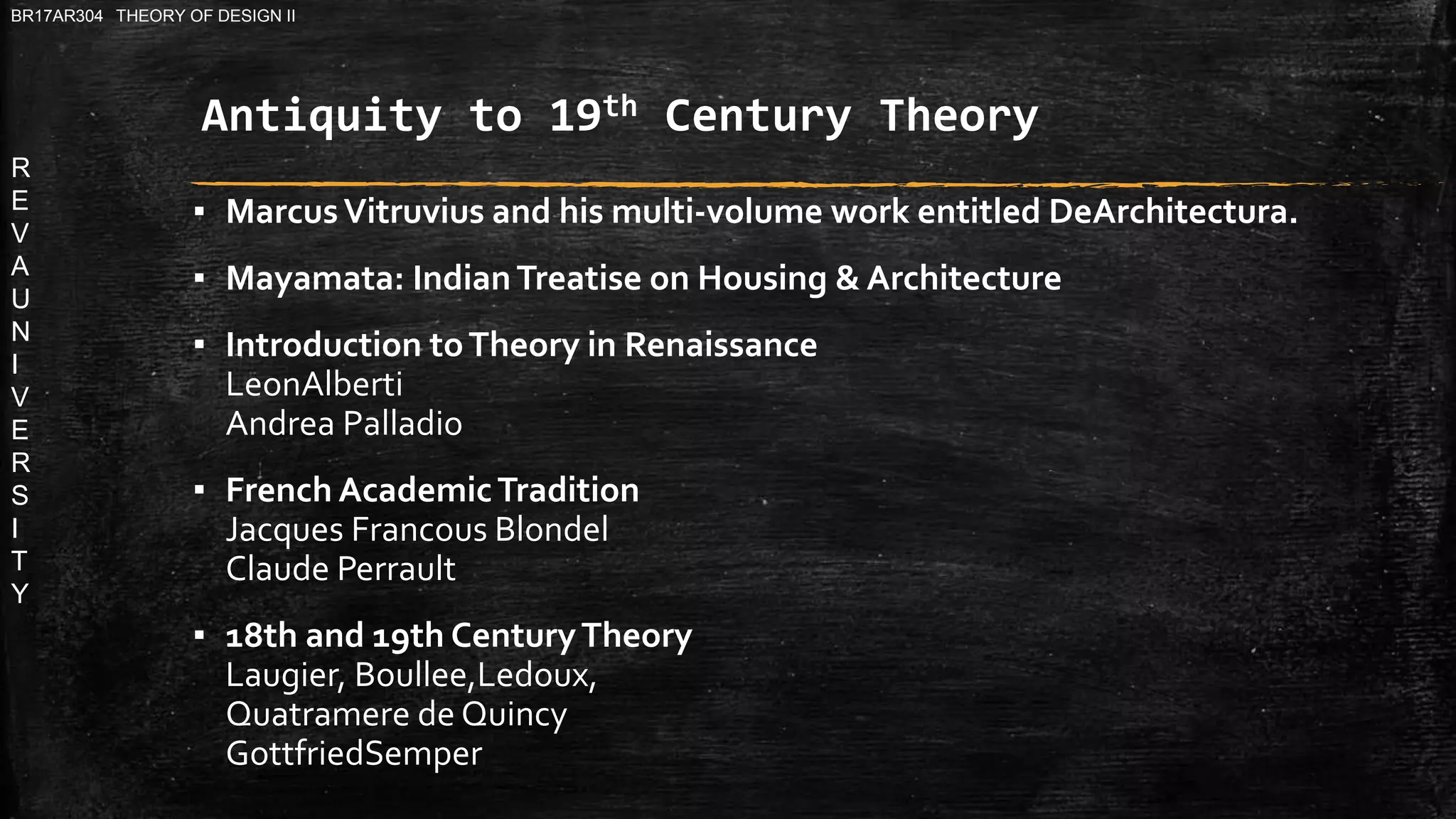 The document discusses various architectural theorists and their works from antiquity through the 19th century. It begins with Vitruvius and his treatise De Architectura from ancient Rome. It then discusses Indian treatises like the Mayamata, and the introduction of theory in the Renaissance with figures like Leon Battista Alberti and Andrea Palladio. It also touches on 18th and 19th century theorists like Laugier, Boullee, Ledoux, and Semper. Vitruvius is described as the most prominent architectural theorist from ancient Rome whose work has been hugely influential. The document also examines Leonardo Da Vinci's Vitruvian Man drawing and how it related proportions of the ideal human form to architecture