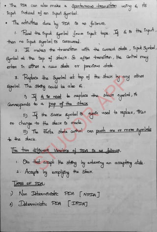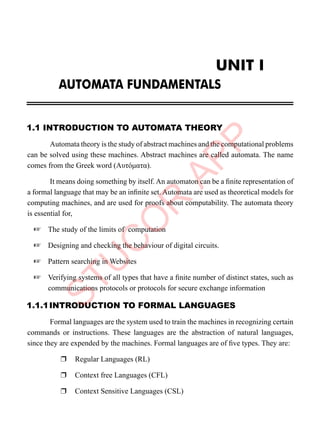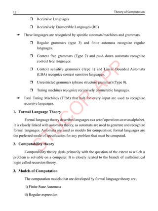 The document provides an introduction to automata theory and formal languages, highlighting their significance in computing and proofs of computability. It categorizes languages into various types recognized by different automata and discusses the mathematical foundations of these concepts. Additionally, it covers the methodology of formal proofs and different forms of reasoning used in programming and mathematical logic.