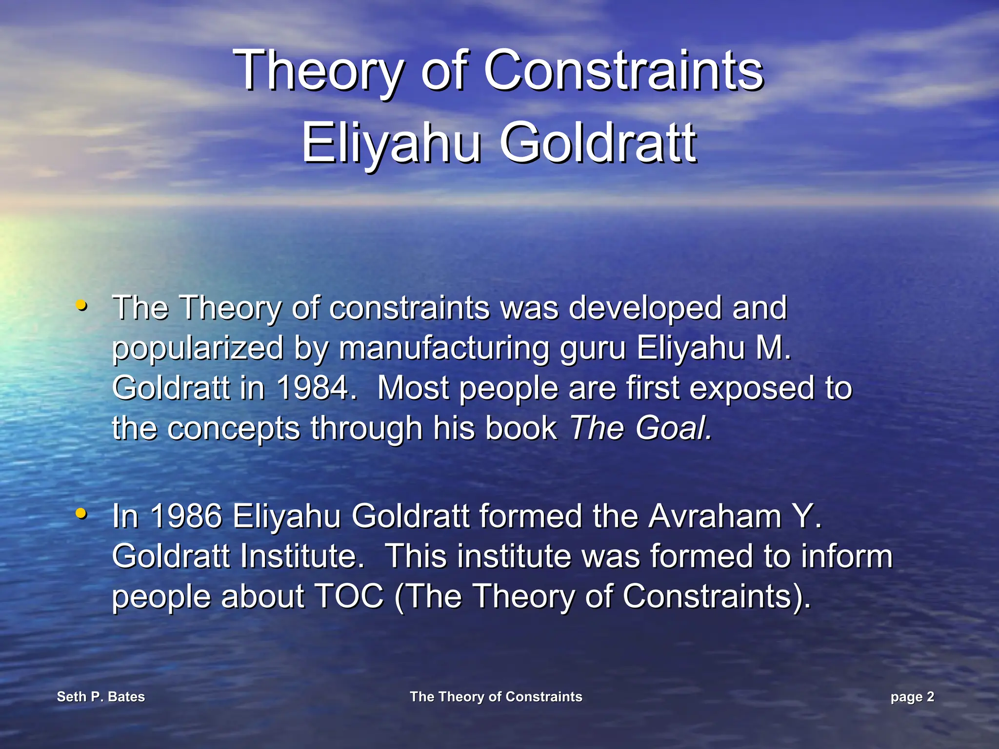 The Theory of Constraints (TOC), developed by Eliyahu Goldratt in 1984, posits that every system has at least one constraint that limits its performance towards achieving goals. The TOC provides a systematic approach for identifying and managing these constraints, emphasizing the need to focus improvement efforts where they can have the greatest impact on outcomes. Key components of TOC include defining constraints, understanding throughput, inventory, and operating expenses, and employing five focusing steps to optimize system performance.