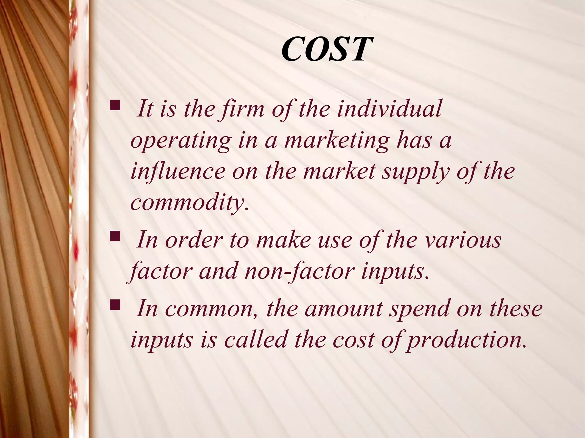 This document discusses different types of costs related to production. It defines money cost, nominal cost, real cost, opportunity cost, implicit cost, explicit cost, accounting cost, social cost, and entrepreneur's cost. It also covers classification of costs, elements of costs, short-run costs including fixed, variable, total, average and marginal costs. Finally, it discusses long-run cost curves including long-run average cost and long-run marginal cost curves.