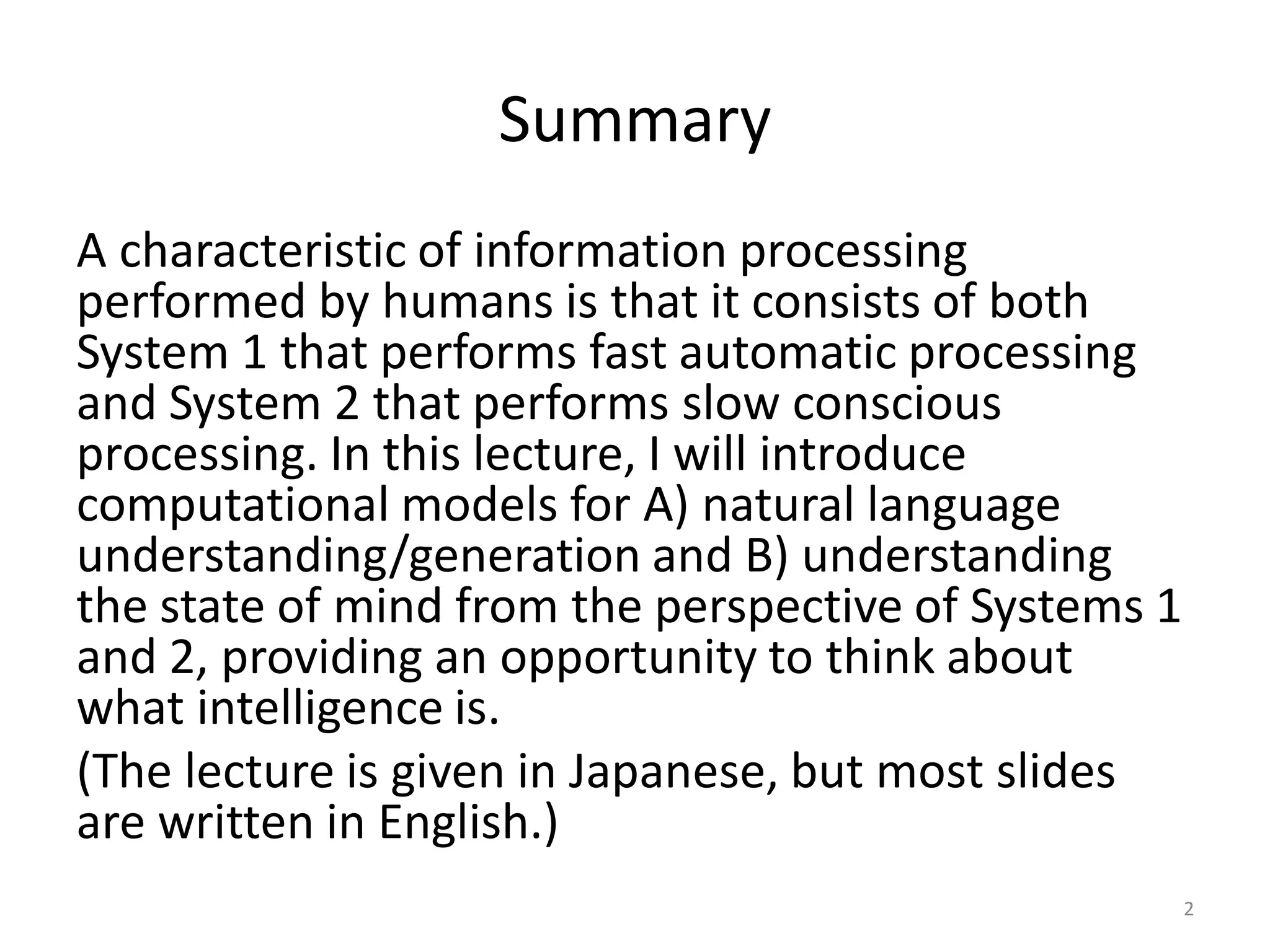This document discusses the dual systems of human information processing, known as system 1 (fast, automatic) and system 2 (slow, conscious). It presents computational models for natural language understanding and mind state comprehension, intending to inspire reflection on the nature of intelligence. The lecture will be conducted in Japanese, with English slides, and includes a report assignment encouraging detailed hypotheses regarding the interaction of the two systems.