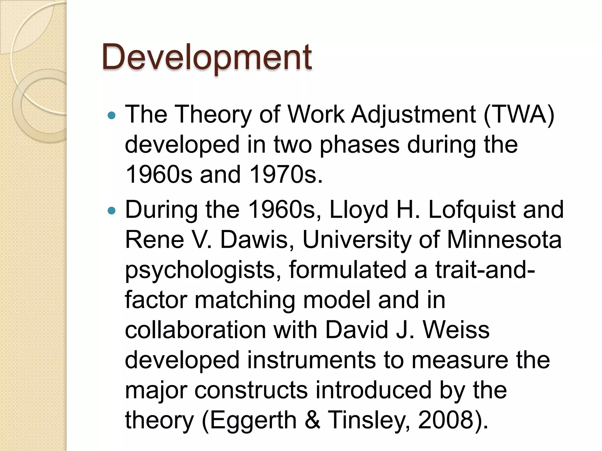 Development  The Theoryof Work Adjustment (TWA) developed in two phases during the 1960s and 1970s.  During the 1960s, Lloyd H. Lofquist and Rene V. Dawis, University of Minnesota psychologists, formulated a trait-and- factor matching model and in collaboration with David J. Weiss developed instruments to measure the major constructs introduced by the theory (Eggerth & Tinsley, 2008).