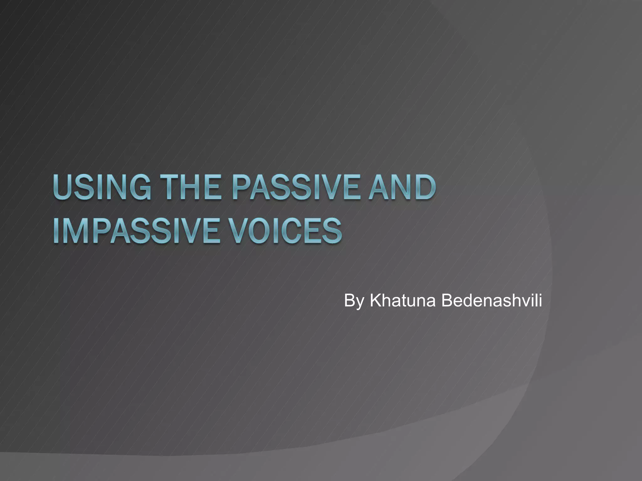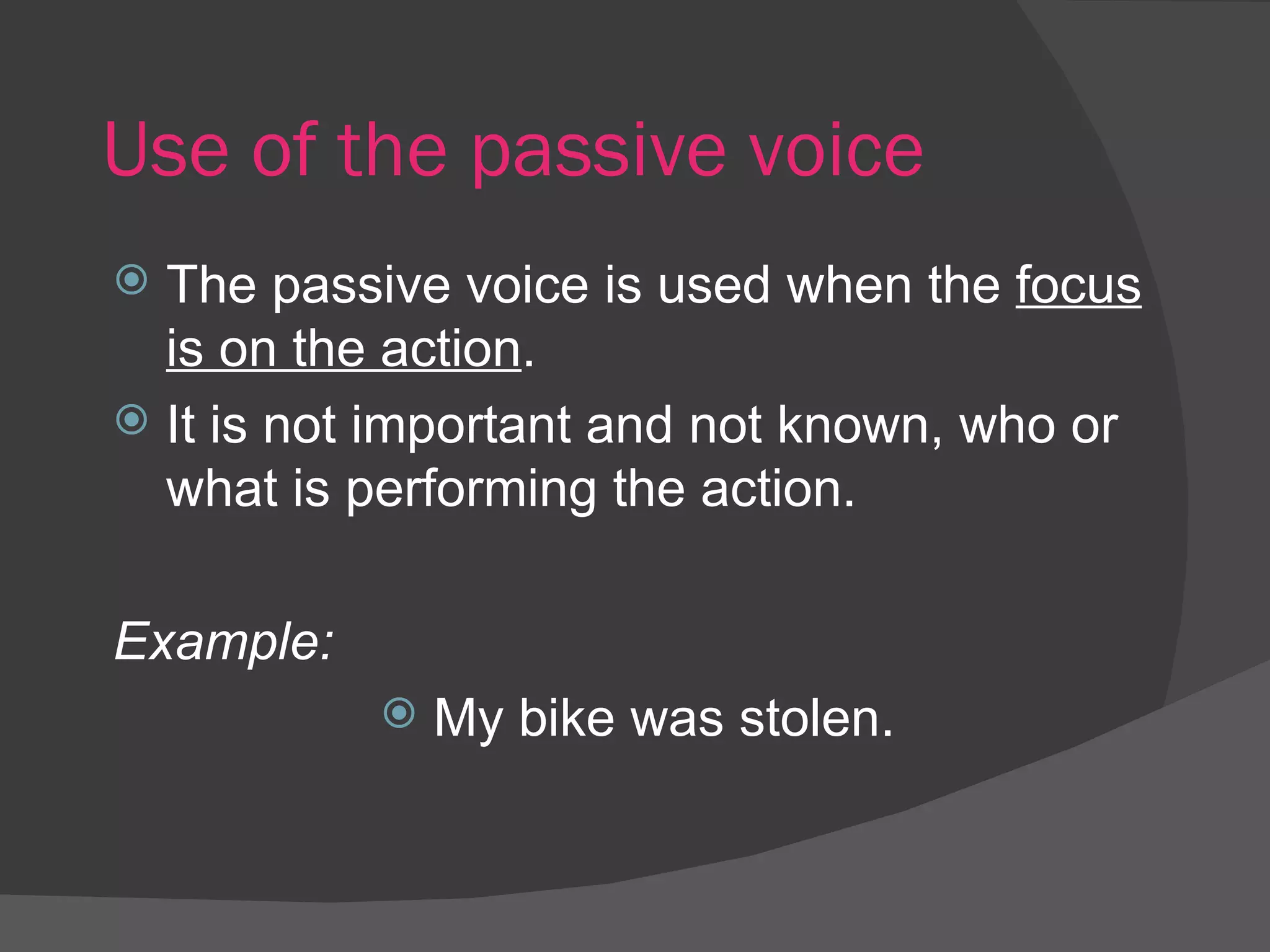 The document discusses the passive voice in English. It provides examples of using the passive voice to focus on the action rather than the subject. It also discusses personal and impersonal passive constructions. The document concludes with exercises asking the reader to rewrite examples in different tenses in the passive voice.