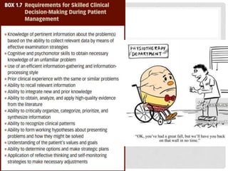 This document discusses clinical decision making in physical therapy. It covers evaluating a patient through examination, determining a diagnosis, establishing a prognosis and plan of care, implementing interventions, and assessing outcomes. Key parts of the examination process are gathering a health history, performing systems reviews, and using specific tests and measures. The evaluation involves analyzing collected data to interpret a patient's condition. Evidence-based practice and a patient management model guide clinical decisions. Motor learning principles also inform effective exercise instruction and functional training.