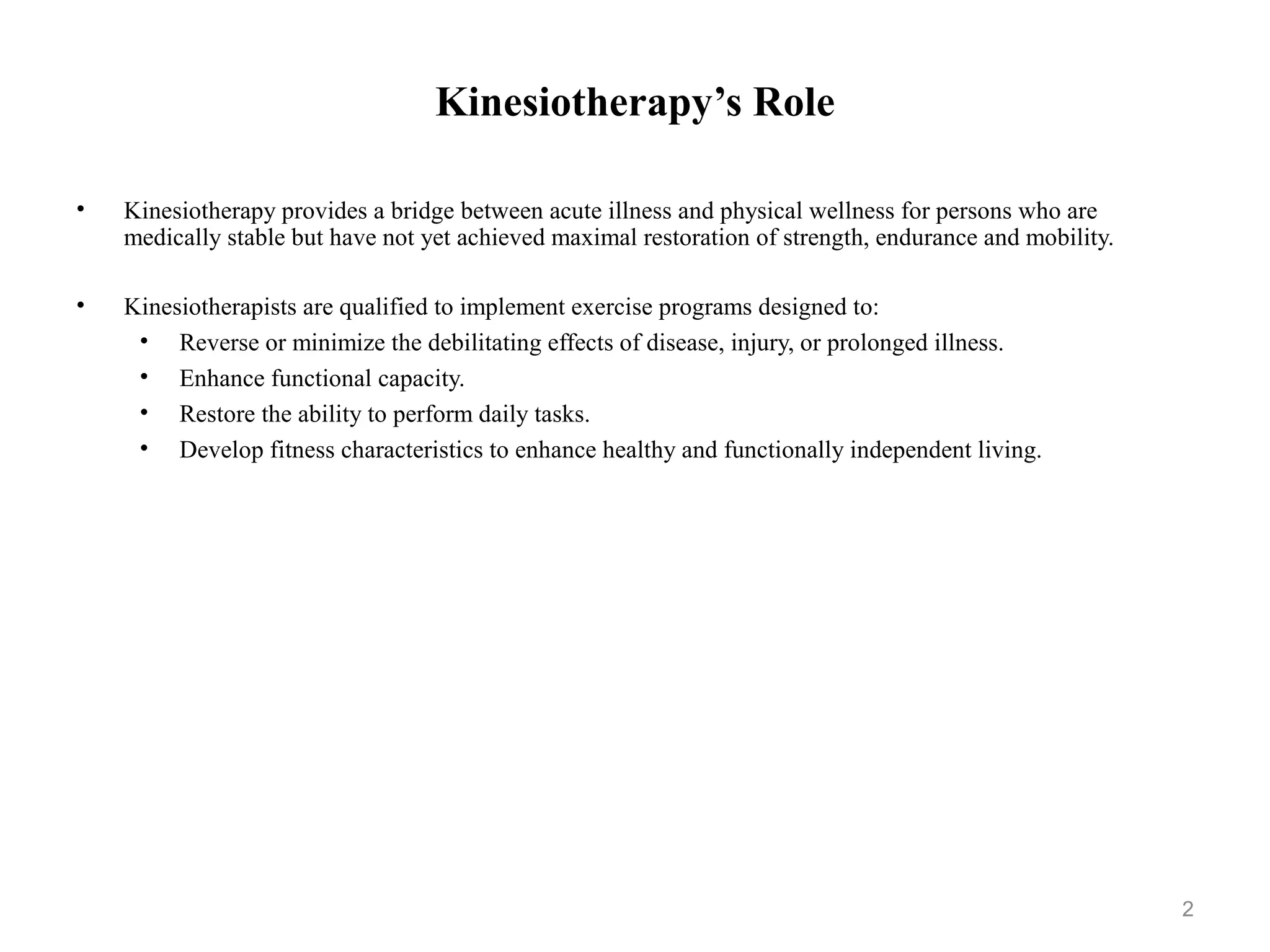 Kinesiotherapy provides exercise programs for medically stable patients to reverse the effects of illness or injury and improve functional abilities. Kinesiotherapists develop treatment plans including exercises and education based on a physician's referral and patient goals. The goal is to restore strength, endurance, mobility and independence through improving components of physical function like range of motion, balance, and cognition.