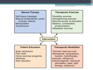 The document discusses various therapeutic modalities used in physical therapy, including thermal, electromagnetic, and mechanical methods, detailing their applications, effects, and contraindications. It covers techniques like cryotherapy, ultrasound, diathermy, and laser therapy, including their clinical applications and physiological effects on conditions such as inflammation and pain management. Additionally, it includes a section on the principles of electricity related to electrotherapy and its implications for muscle activation and pain modulation.