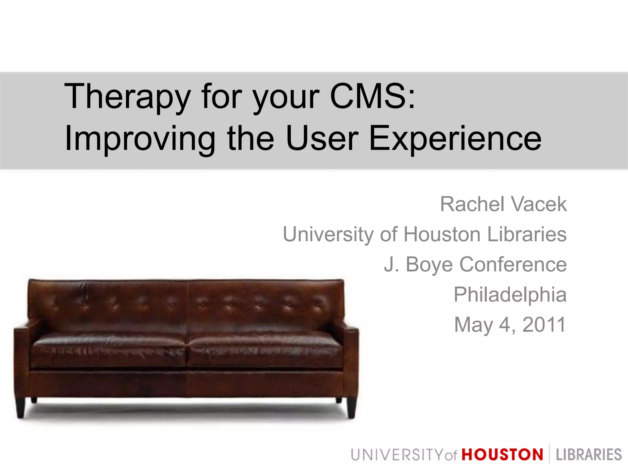 The document discusses the University of Houston's experience in improving user experience with their content management system (CMS) through an intranet redesign using Drupal. Despite initial success, challenges emerged such as poor search functionality and confusing terminology, leading to a need for simplified usage and training. The subsequent redesign of the main website incorporated lessons learned, resulting in a more user-friendly CMS that increased content editor engagement and satisfaction.